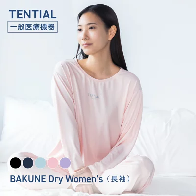 TENTIALの 「BAKUNE」シリーズは、極小セラミック粉末を練り込んだ「SELFLAME®」素材によって遠赤外線で血行を促進する機能を持つリカバリーウェア。寝返りを妨げない設計や自然な着心地で、睡眠中の体のケアに最適です。洗濯機で洗える耐久性もあり、日常使いの眠りウェアとして選ばれています。